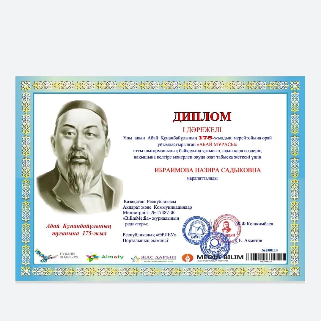 Назира Садықова Ибраимова "Абай мұрасы" байқауында Абайдың "Қара сөздерін"мәнерлеп оқығаны үшін марапатталды. Награждена Ибраимова Назира Садыковна за выразительное чтение " Слов назидания" Абая в конкурсе " Наследие Абая".