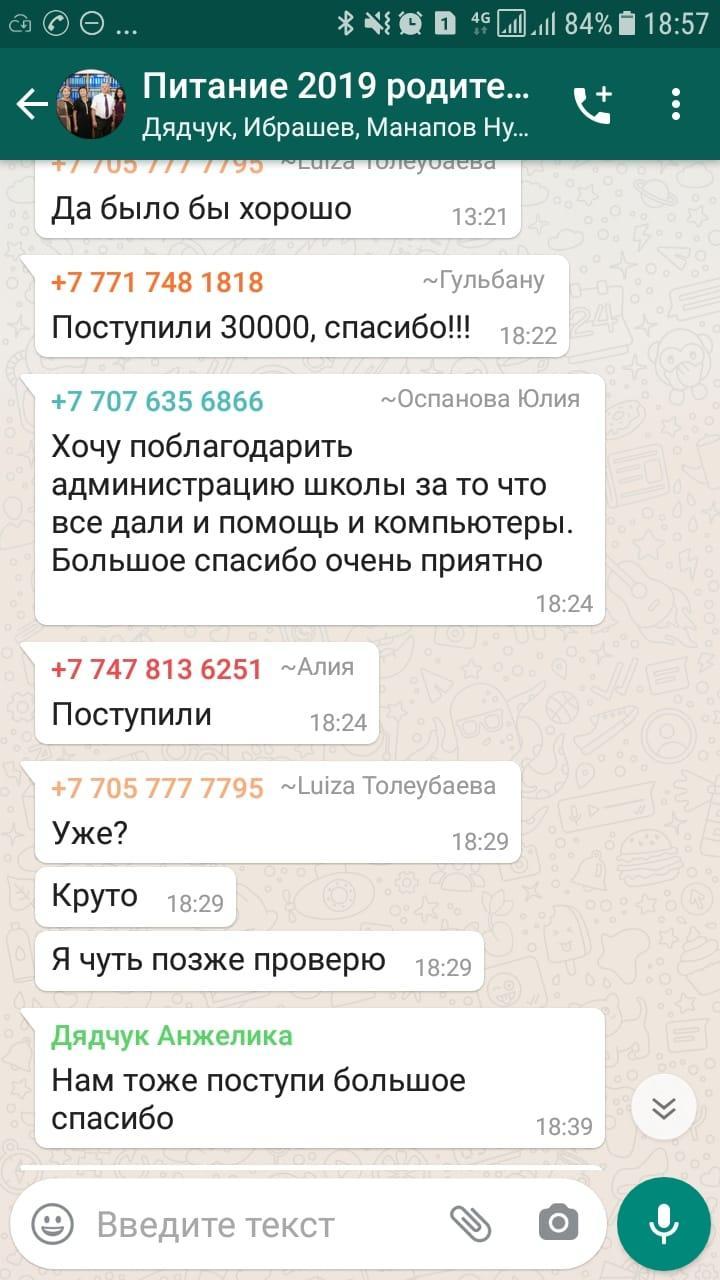 Оқушылардың ата-аналары мектеп әкімшілігіне оларды техникамен қамтамасыз еткені үшін, сондай-ақ аз қамтылған отбасылардан шыққан балаларға қаржылай көмек көрсеткені үшін алғыс білдіреді.
