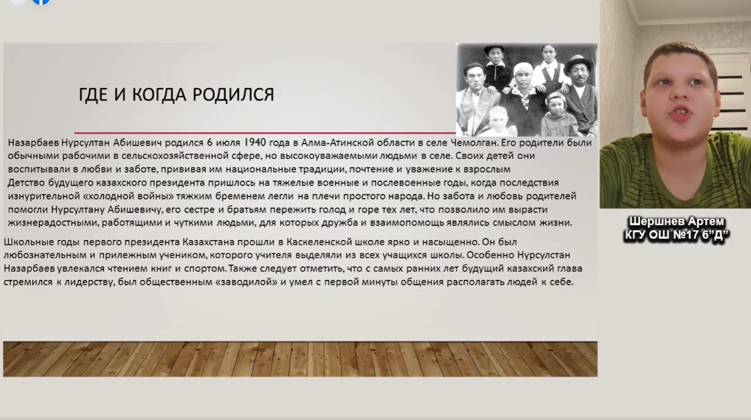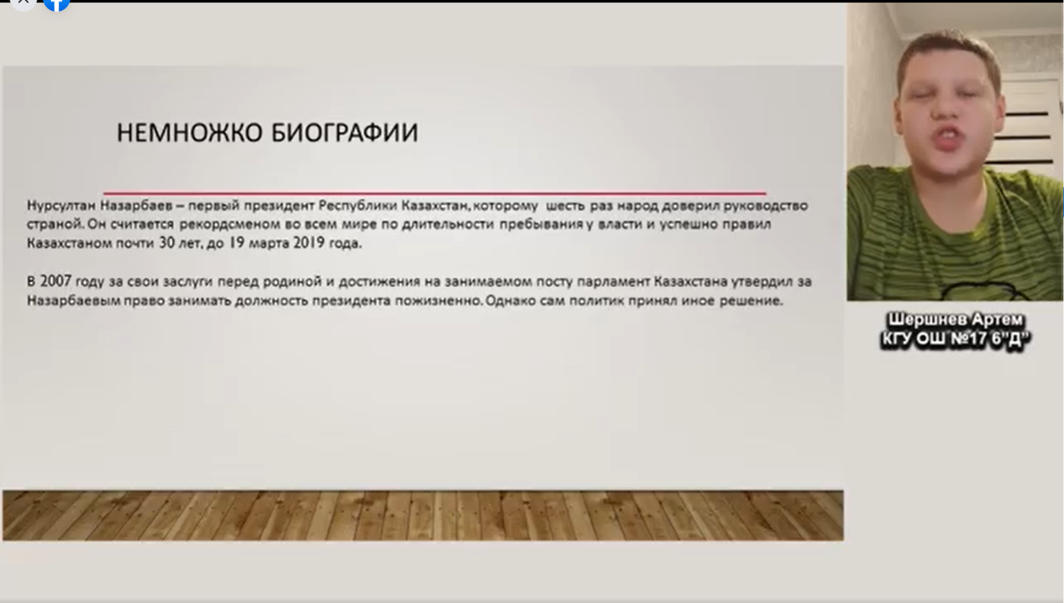 6 "Д" сынып оқушысы Хорнев Артеммен бірге бейне презентация. "1 желтоқсан-Қазақстанның Тұңғыш Президенті күні". Видео презентация совместно с учащимся 6 "Д" класса Шершневым Артемом. "1 декабря -День Первого Президента Казахстана".