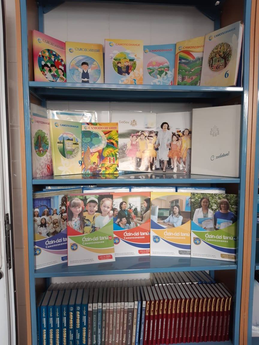 В библиотеке школы была организована книжная выставка «Мейірім төгетін ана» о деятельности автора программы нравственно-духовного образования.
