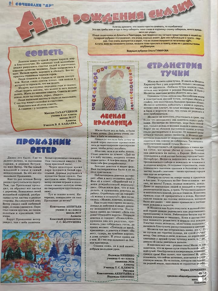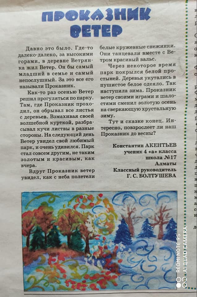 4"А" сынып оқушысы Акентьев Константиннің "Дружные ребята"республикалық газетінде жариялануы. "Жел-пранкстер" ертегісі. Публикация ученика 4 "А" класса Акентьева Константина в Республиканской газете "Дружные ребята". Сказка "Ветер-проказник".