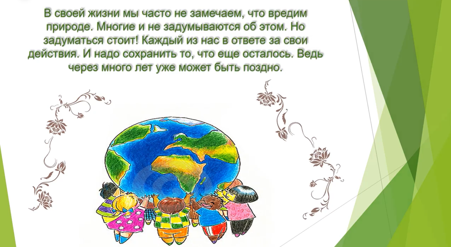 Балалар виртуалды кітапханаға барды ("табиғат туралы не білеміз"кітаптар көрмесі). Онда олар балаларға ғана емес, орта мектеп оқушыларына да қызықты болатын кітаптармен таныстырылды. Сонымен қатар, бұл кітаптарды интернетте еркін жүктеуге болады, бұл карантин кезінде өте маңызды. Жоғары сынып оқушылары "Жер – біздің ортақ үйіміз"бейнеролигін дайындады.