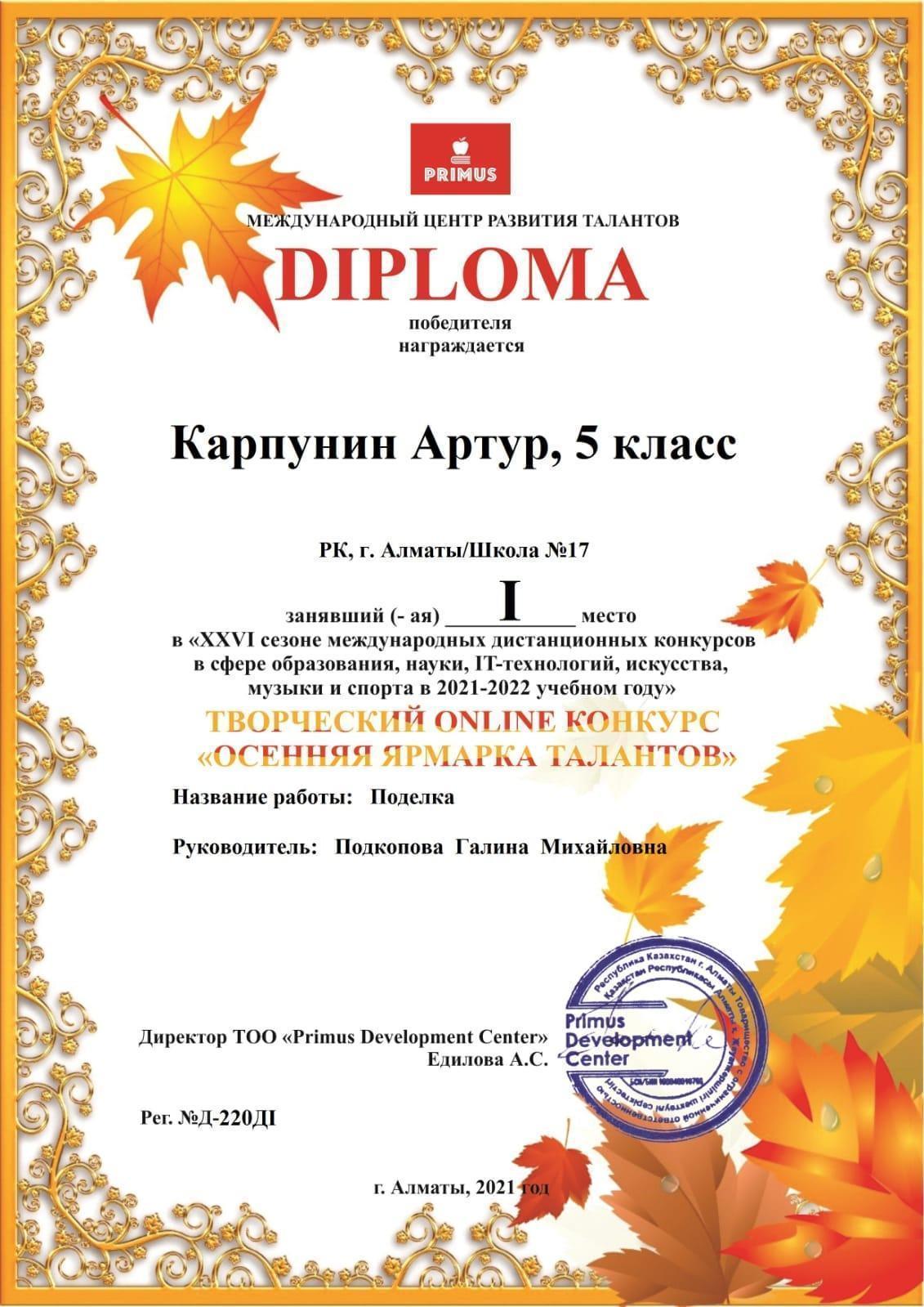 Карпунин Артур 5"Б" сынып оқушысы "Күзгі таланттар жәрмеңкесі"онлайн байқауына қатысты. 1 орын алды.