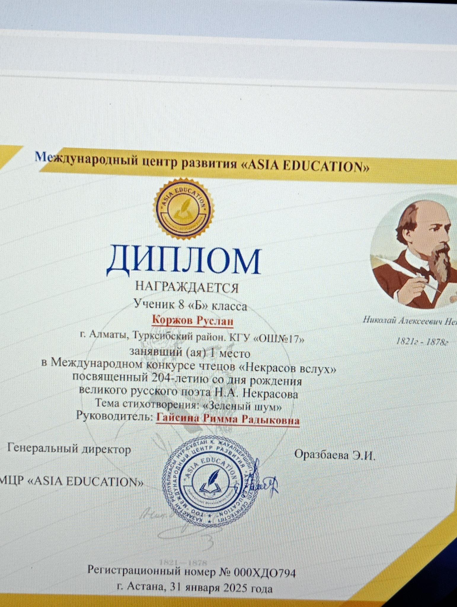 "ASIA EDUCATION" халықаралық даму орталығы ұлы орыс ақыны Н. А. Некрасовтың туғанына 204 жыл толуына орай "Некрасов дауыстап" атты бейнеконкурс өткізді.8" Б " сынып оқушысы Коржов Руслан қатысып, 1 орынға ие болды! Байқаудағы лайықты және батыл жеңісімен құттықтаймыз. Сіздің жаныңыз жарқын эмоцияларға толы болсын, жақын достарыңыз бұл қуанышты сізбен бөліссін. Бұл соңғы жеңістен алыс болсын, өмір сізге өзіңізді дәлелдеуге және құрметке, құрметке, көптеген марапаттар мен сыйлықтарға ие болуға көптеген мүмкіндіктер берсін.