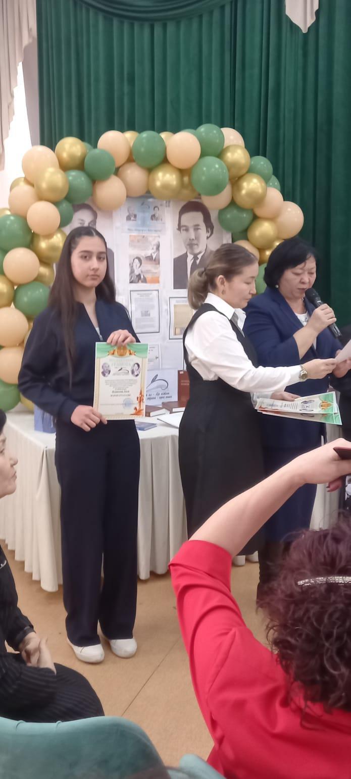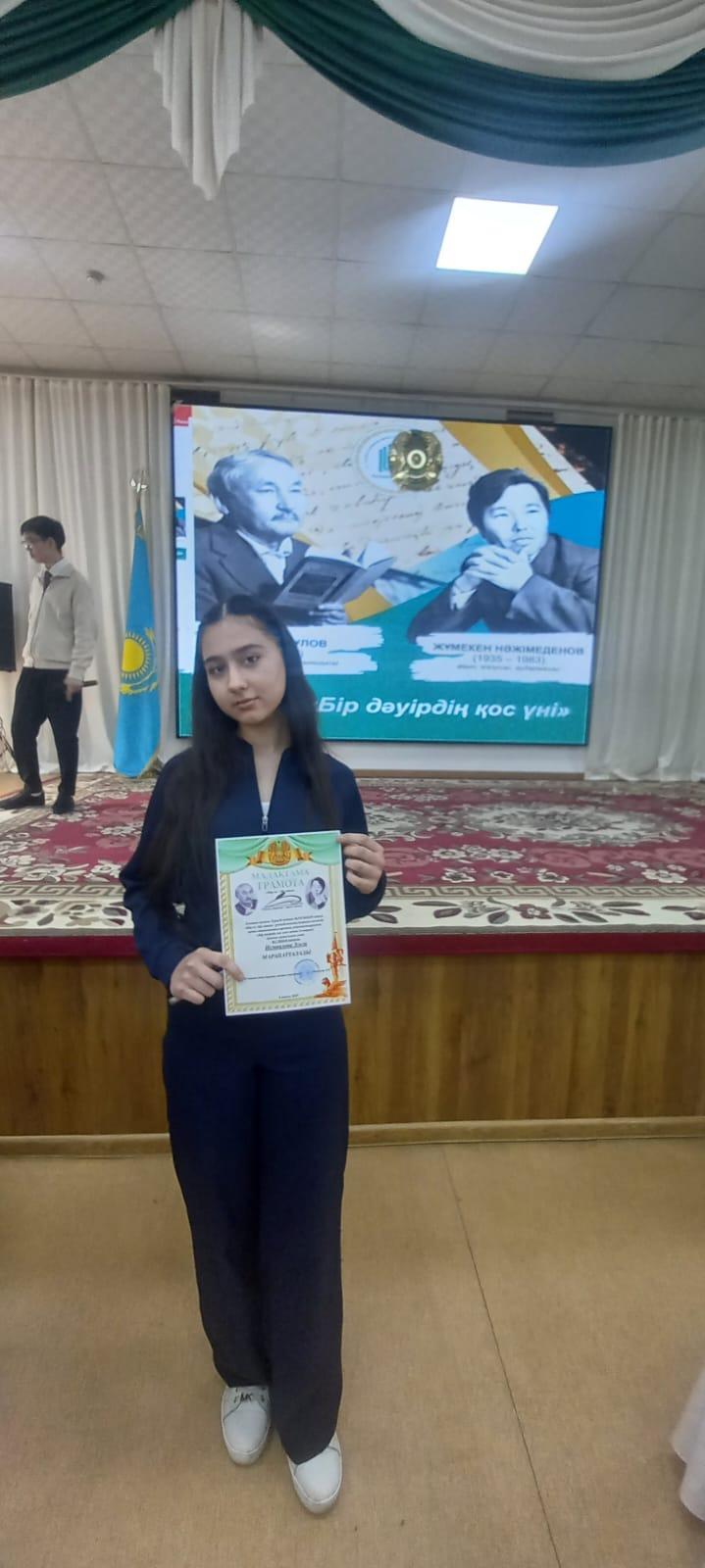 В школе-гимназии №195 прошел вечер, посвященный Такену Алимкулову и Жумекену Нажимеденову под названием «Два голоса одной эпохи»., нашей школы приняла участие ученица 7А класса Эльза Исмаилова и прочитала стихотворение Ж. Нажимеденова.