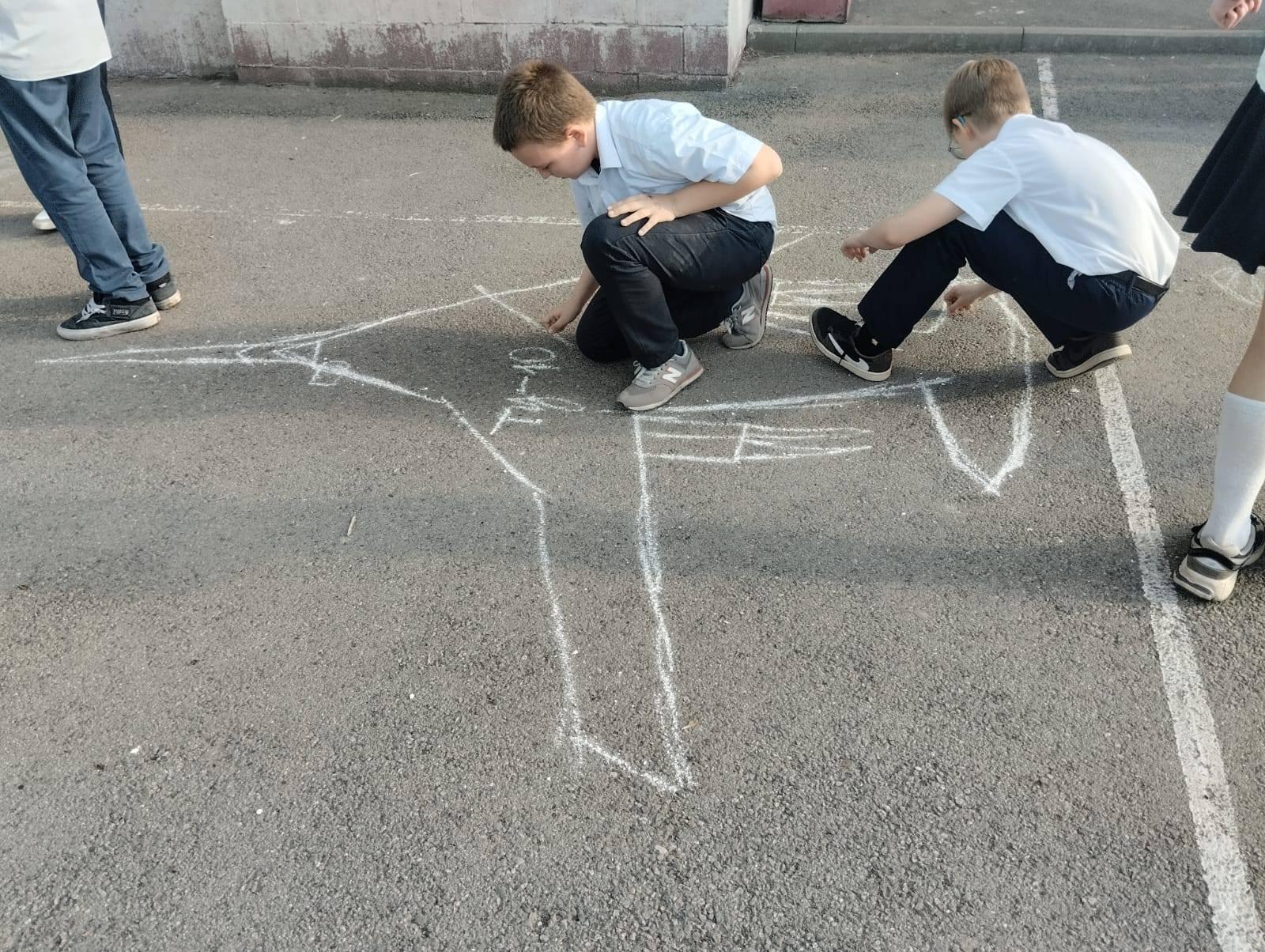 1 мамыр мен Ұлы Жеңістің 80 жылдығына арналған тақырыптық сабақ , асфальттағы сурет. Тематическое занятие , рисунок на асфальте, приуроченное 1 мая и 80-ти летию Великой Победы.
