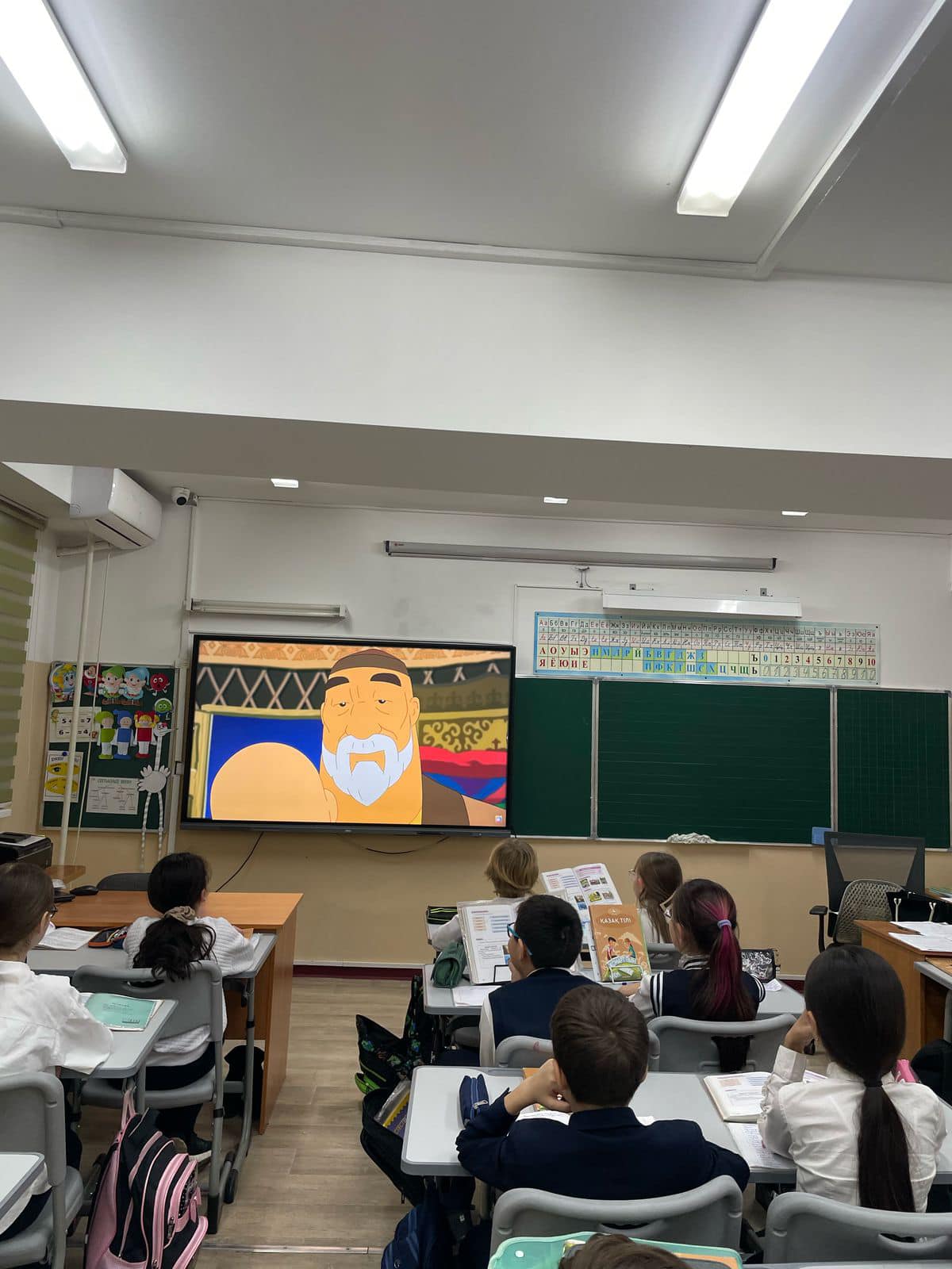 В школе с неказахским языком обучения в рамках проекта “языковой потфель” с целью расширения использования “повседневного казахского языка” для учащихся начальных классов мы показали мультфильм “Кажымукан” и обсудили его вместе.