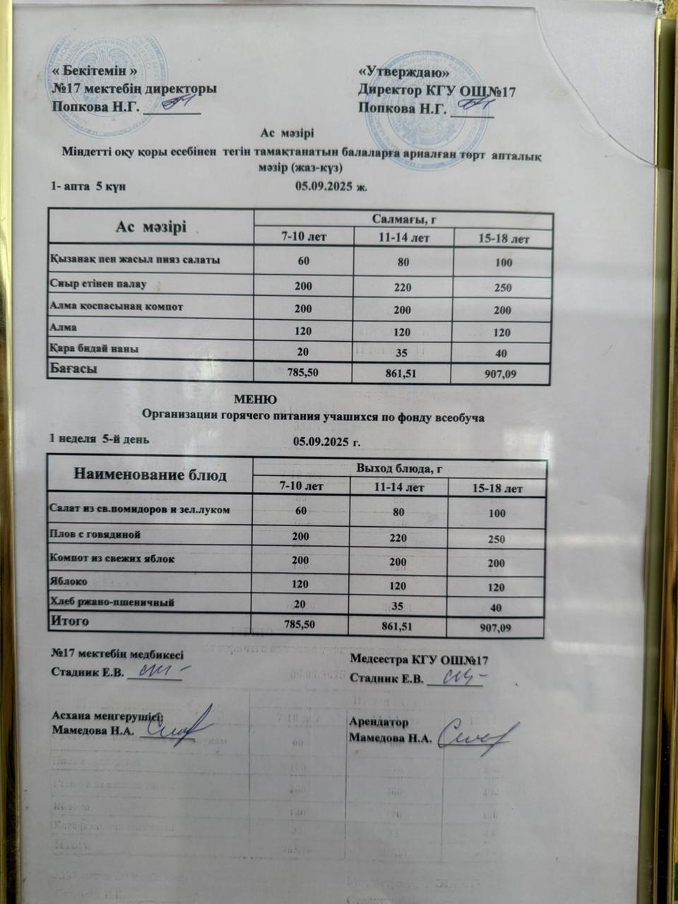 Ас мәзірі 17.01.2024ж. Меню 17.01.2024г.