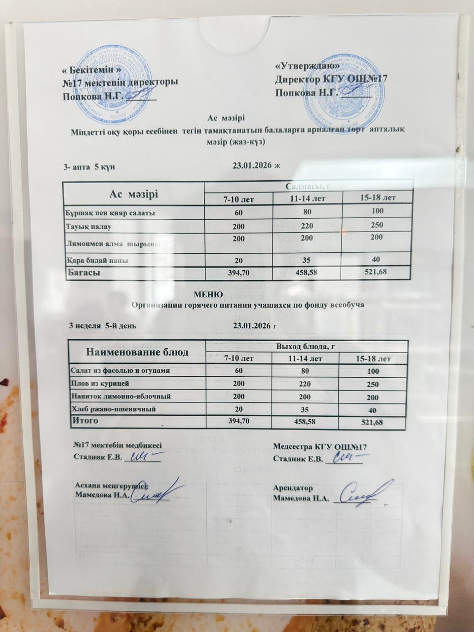 Ас мәзірі 17.01.2024ж. Меню 17.01.2024г.