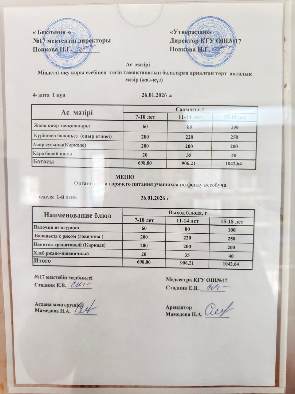 Ас мәзірі 17.01.2024ж. Меню 17.01.2024г.