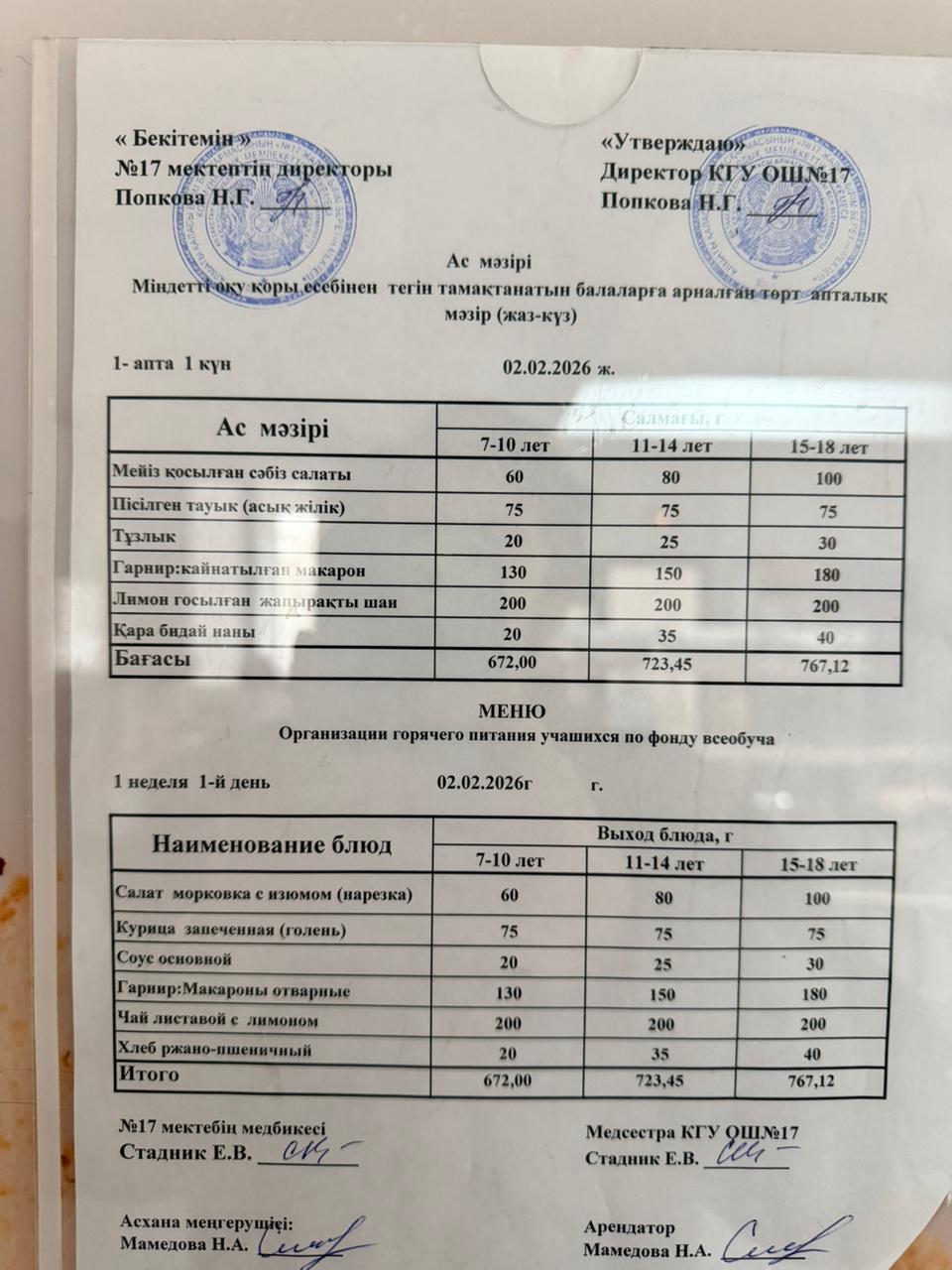 Ас мәзірі 17.01.2024ж. Меню 17.01.2024г.