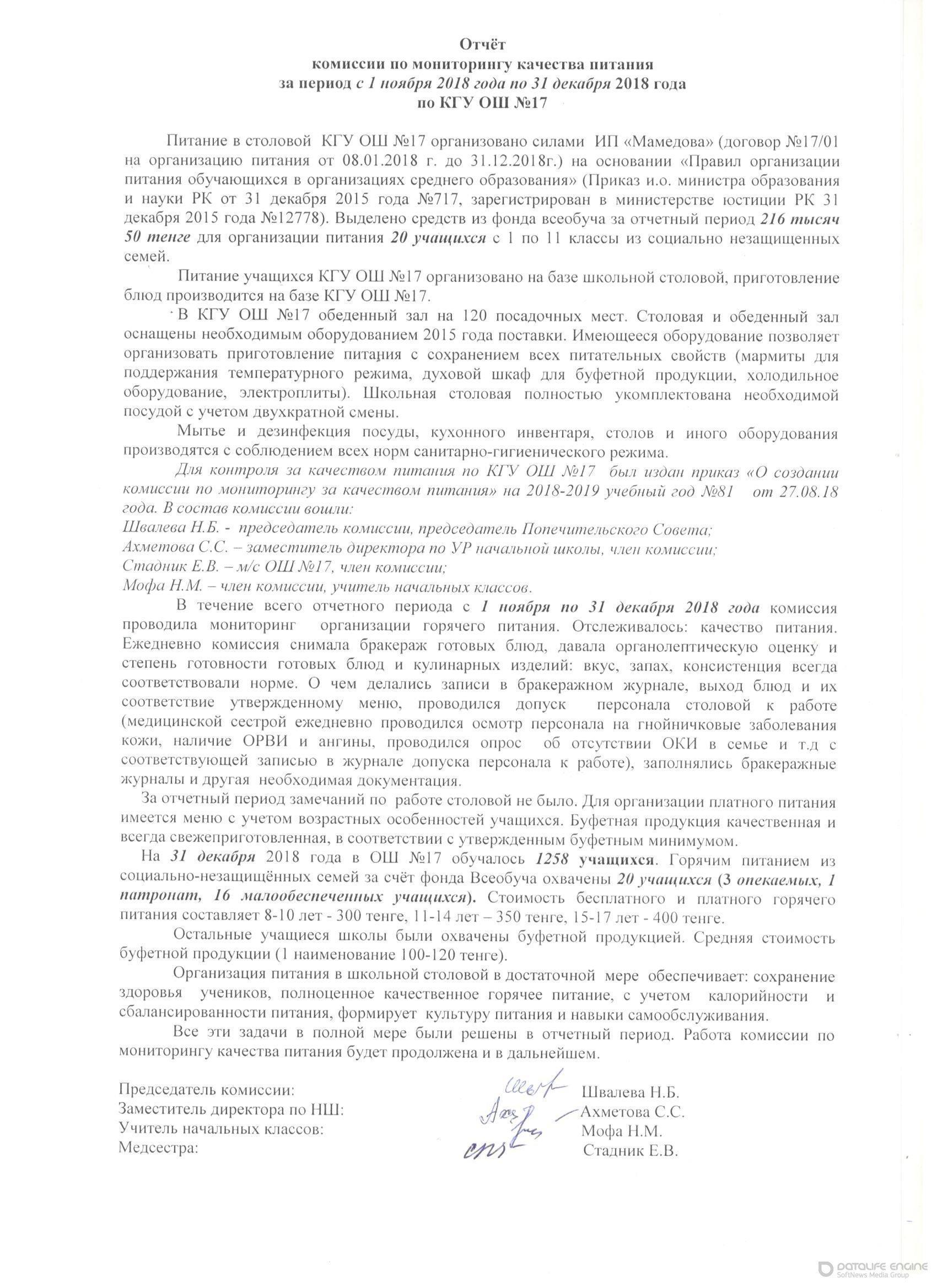 Отчёт комиссии по мониторингу качества питания за период с 1 ноября 2018 года по 31 декабря 2018 года по КГУ ОШ №17