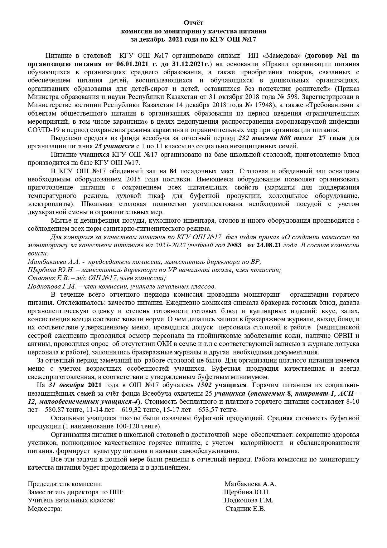 31 желтоқсан 2021 0 1 2 3 4 5 Тамақтану сапасын бақылау жөніндегі комиссияның 2021 жылғы желтоқсандағы есебі. Отчет комиссии по мониторингу за качеством питания за декабрь 2021 года. otchet-po-pitaniju-dekabr-2021-2022.pdf Посмотреть онлайн файл: otchet-po-pitaniju-dekabr-2021-2022.pdf Осы беттің QR-коды:QR-код этой страницы: