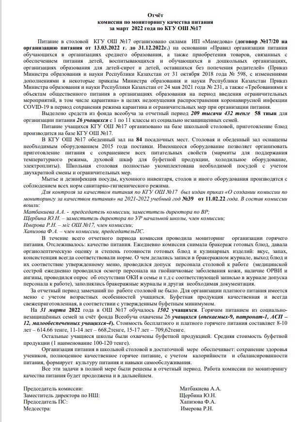 25 наурыз 2022 0 1 2 3 4 5 Тамақтану сапасын бақылау жөніндегі комиссияның 2022 жылғы наурыздағы есебі. Отчет комиссии по мониторингу за качеством питания за март 2022. otchet-po-pitaniju-mart-2021-2022.pdf Посмотреть онлайн файл: otchet-po-pitaniju-mart-2021-2022.pdf Осы беттің QR-коды:QR-код этой страницы: