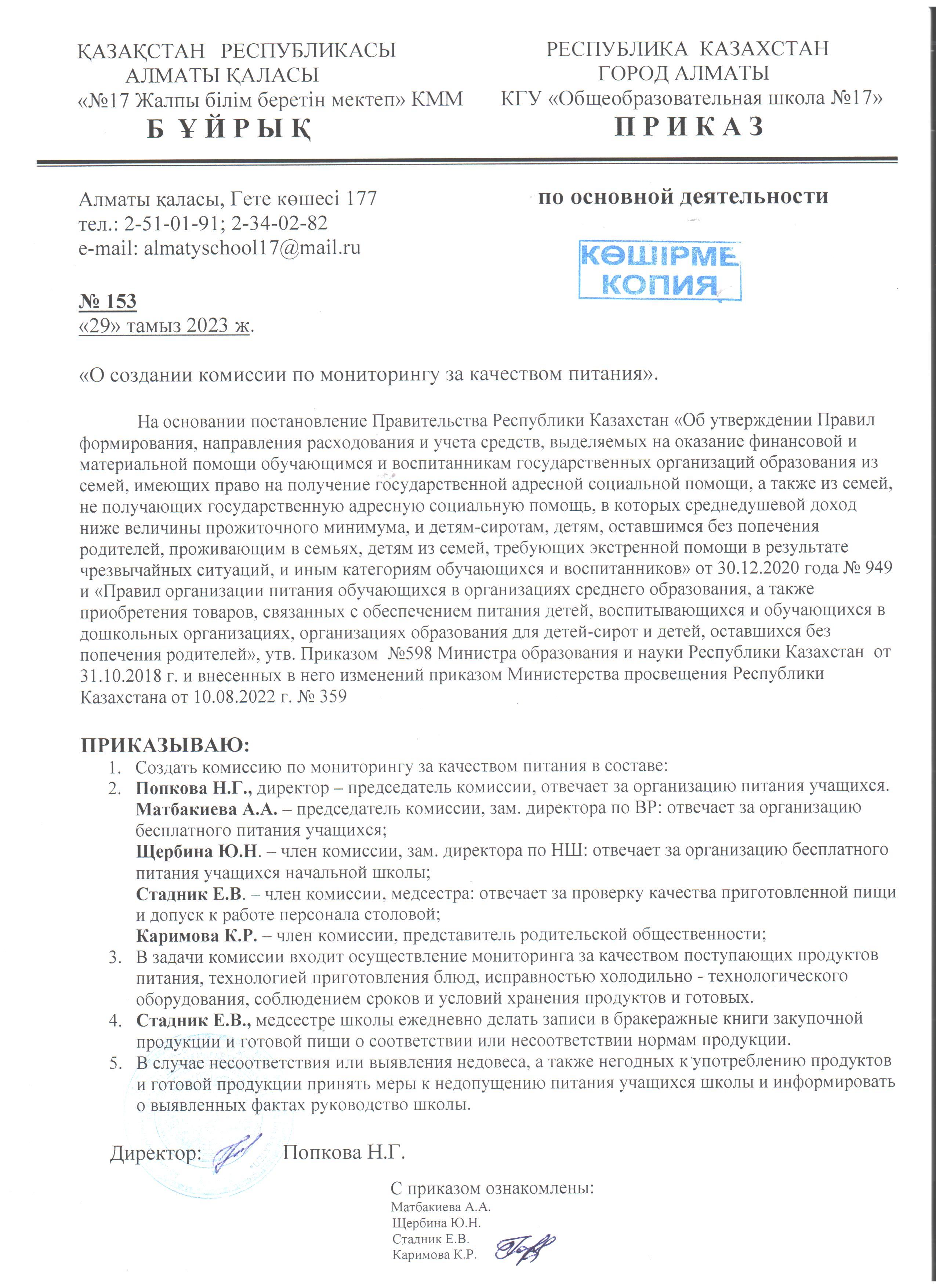 29 тамыз 2023 0 1 2 3 4 5 Тамақтану сапасына мониторинг жүргізу жөніндегі комиссия құру туралы бұйрық. Приказ о создании комиссии по мониторингу качества питания Осы беттің QR-коды:QR-код этой страницы: